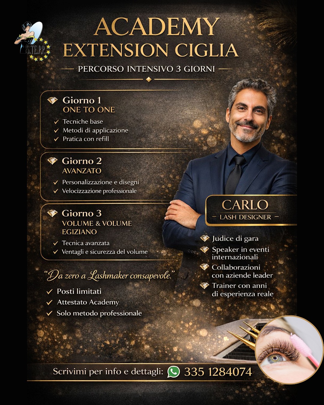 Formatore professionista con anni di esperienza e centinai di tecniche formate nel settore extension ciglia.
